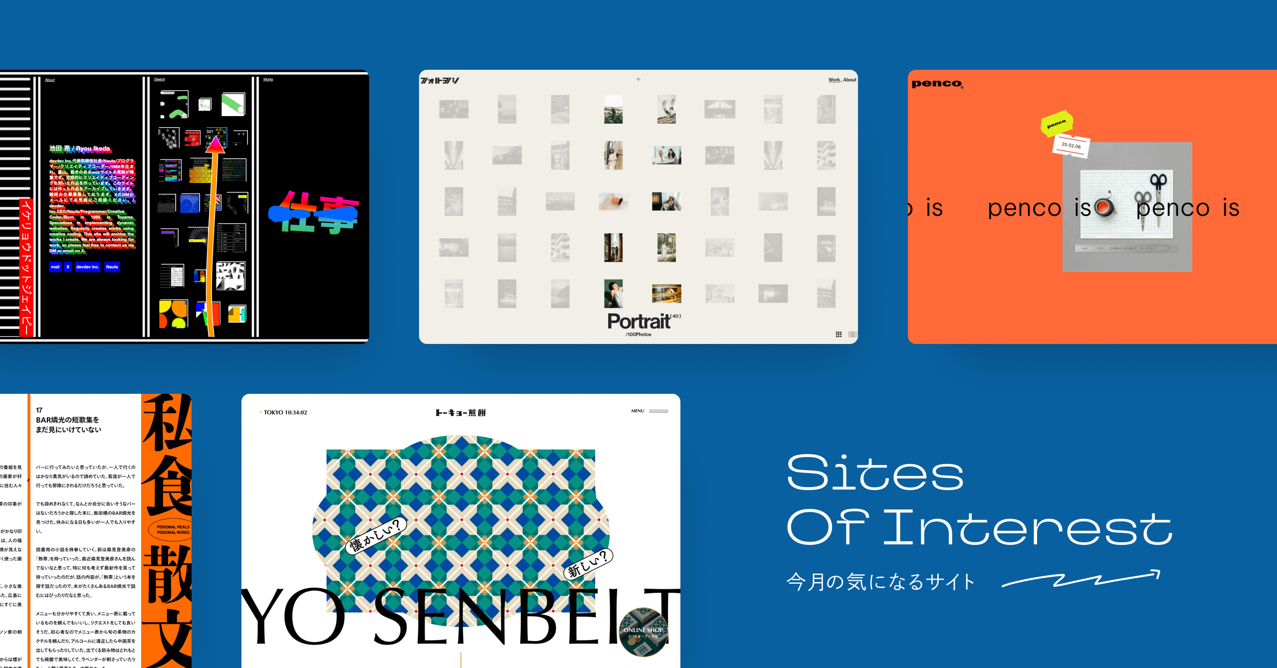 今回も気になるサイトがたくさんありました。機能性と手触りがシームレスにつながった「PHOTOYOSHI」。ただの”印影”に壮大な歴史や重みがあったことに気付かされた「シャチハタ100周年サイト」。子供の頃の思い出をサイトでの体験によって思い起こさせた「penco」。”リアリティではないリアル”を感じさせた「令和6年度警視庁採用サイト」。自社制作/自主制作の可能性ということでの「名古屋たちばな高等学校マーチングバンド部」「書き初め2025|スピッカート」。などなどです。