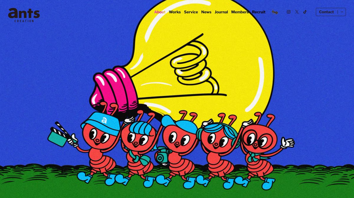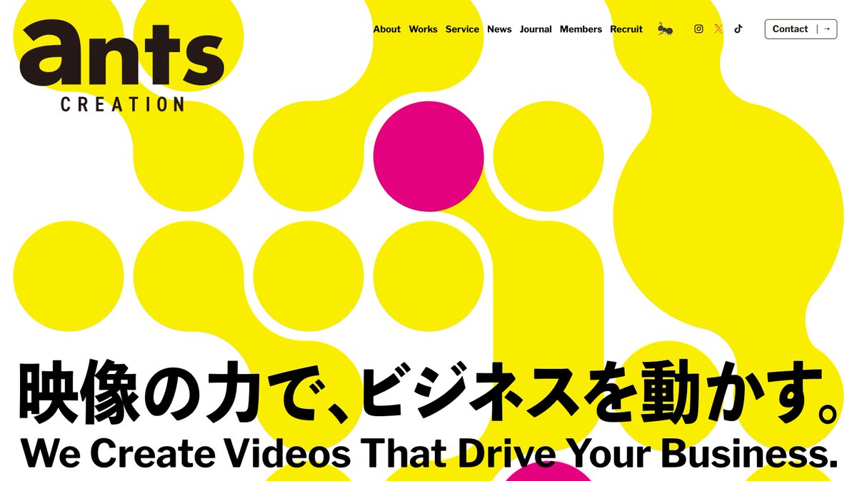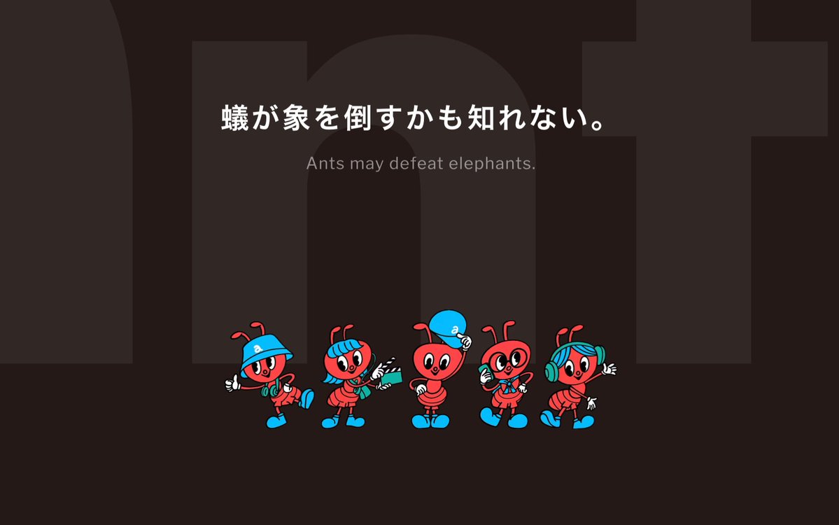 社名である「ants」→「アリの巣」をアイコニックに象徴化。シンプルで明快!そして隠れキャラがかわいいが、フッターの小さい「蟻が象を倒すかも知れない。」により、かわいさは「力強さ」に反転されるのだ。