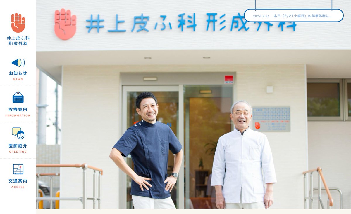 ロゴがよすぎる。皮ふ科だから「手」であり、井上先生の「手」でもあり、手のひらには「井上」だ。ウェブサイトでもロゴが機能的に活かされている。